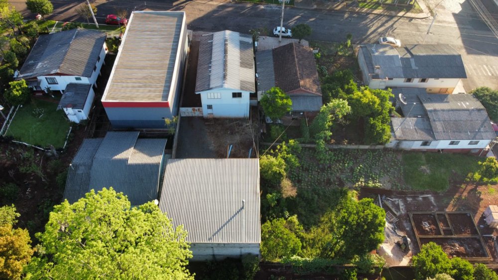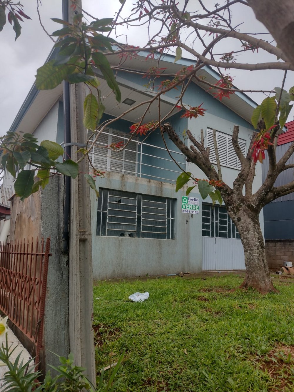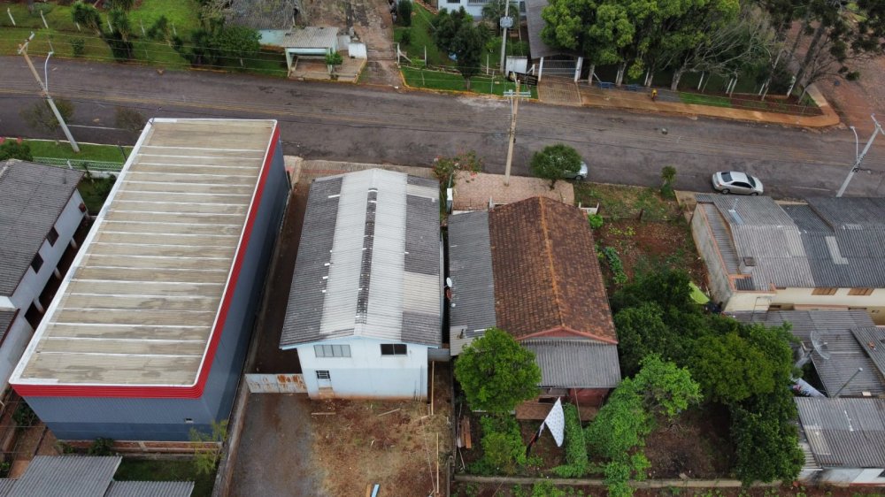O terreno possui 480m², uma casa de dois pisos (175m²) e um pavilhão de 132m².
